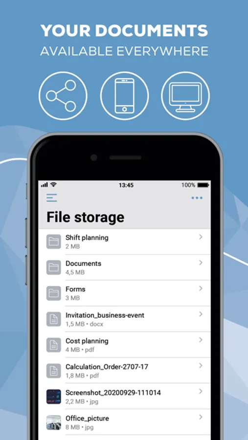 Own and shared file storage: Each user has a personal file storage in which documents and files can be stored, accessed and shared with other users at any time. Every #Channel and every chat has its own file storage.