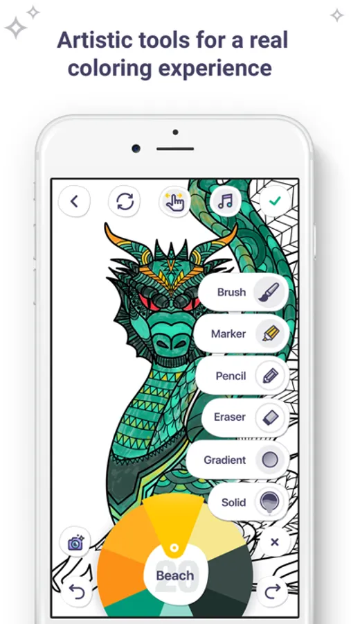- Various coloring tools: color in a simple way with the tap-to-color tool or have real coloring experience using markers and pencils