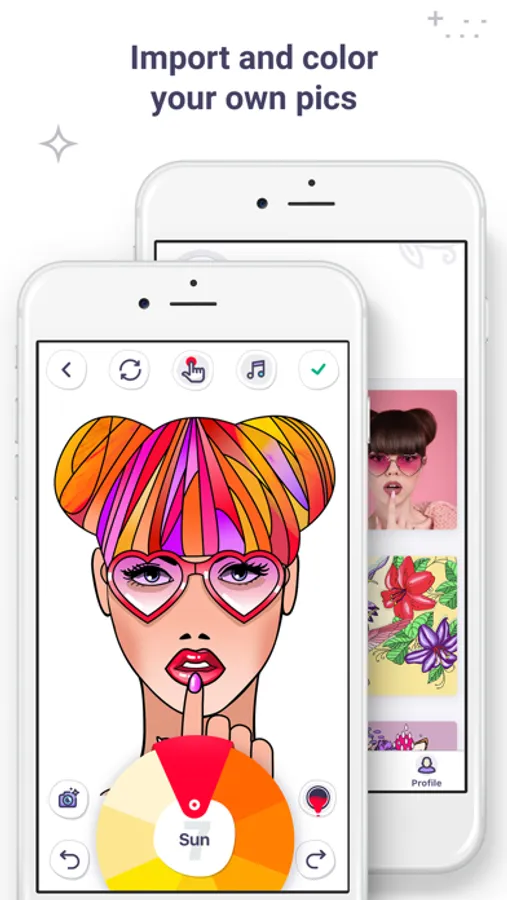 - Your own coloring pictures in the app: import outline drawings from your camera or Camera Roll to color them right on your device