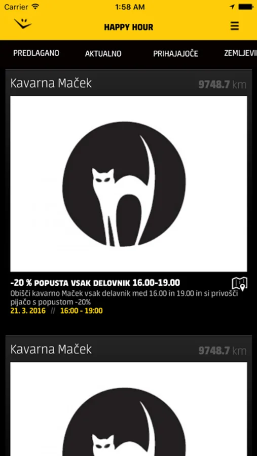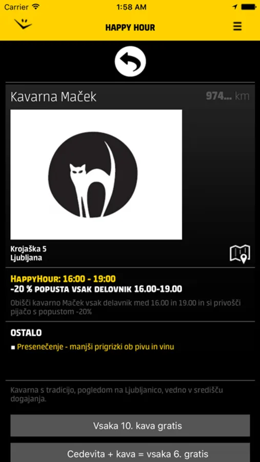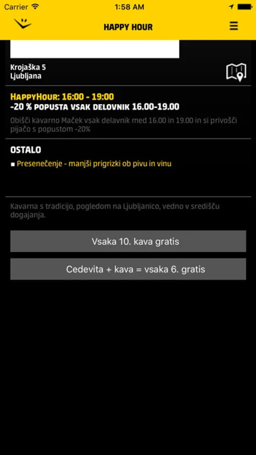 With detailed info about establishment (name, address, opening hours, photo, location on interactive map) HAPPY HOUR app delivers to all its users a current info regarding instantaneous offer and announces the offers to come.