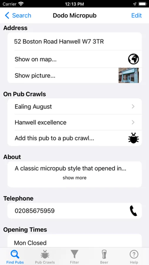 There is information about each pub such as opening hours, address and contact details, whether it serves food, its Food Standards Agency Hygiene Rating and what kind of beer it sells. Each pub can be displayed on a map. Please contact the pub to confirm opening times or other information that may be important to you - you can phone the pub directly from the app. You can also ask Pub Crawler to find pubs near you and restrict the search to pubs that sell real ale.