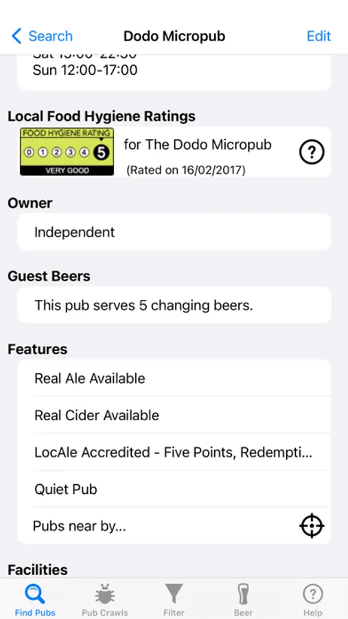 Want to find pubs and find out what beer they sell, when they serve meals and what their official food hygiene rating is? Then Pub Crawler is for you.