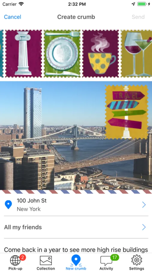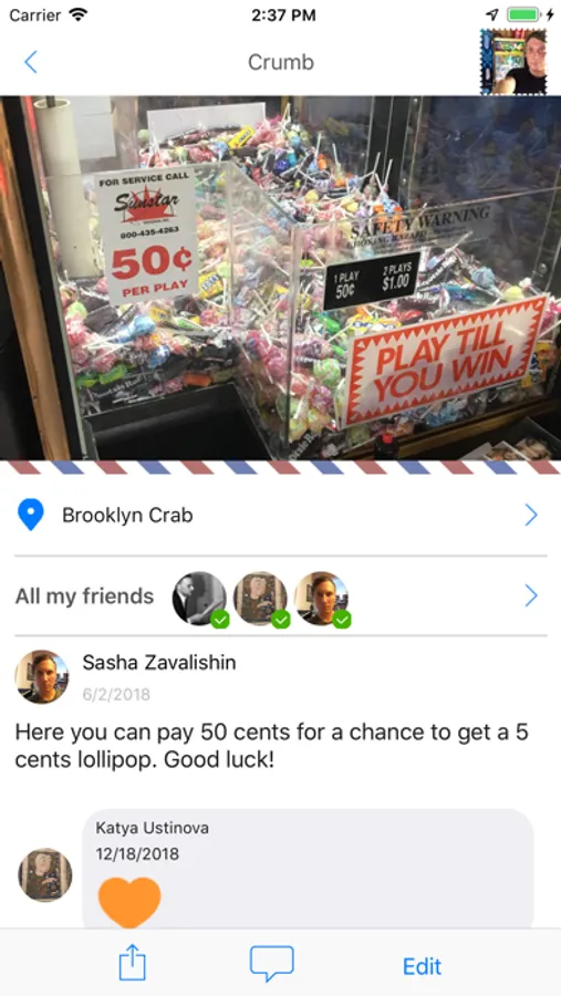 Pigeon Post is a location-based messaging app for travel notes and memories. Crumbs, as the messages are called, must be picked up where senders have left them, be it a cafe around the corner, a shop overseas, or the North Pole. When you find someone else's crumb, you learn something new about the person and the place. When others find your crumbs, you learn what they think about them. Surprise and get surprised!