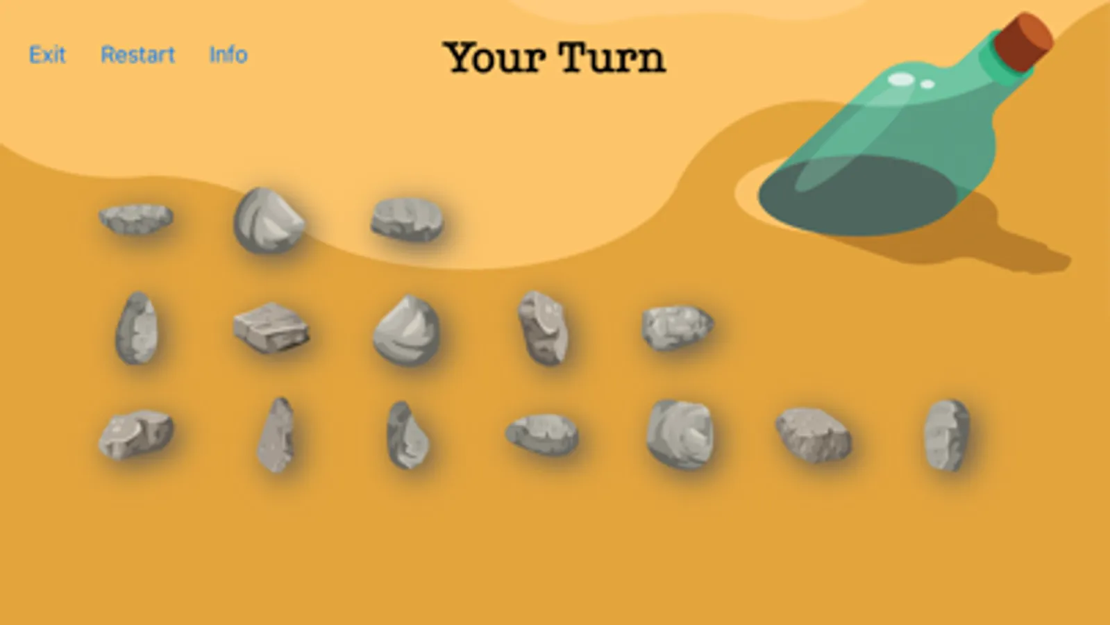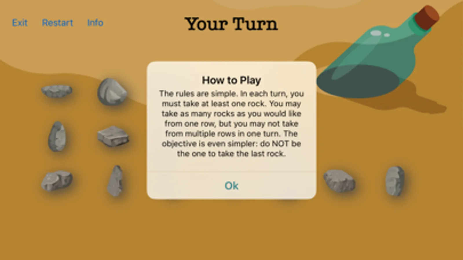 The objective of this game is very simple: do NOT be the one to take the last rock. This can be very tricky and deceivingly hard. The rules are also very basic: you must take at least one rock every turn, and you may not take rocks from two separate rows in the same turn.