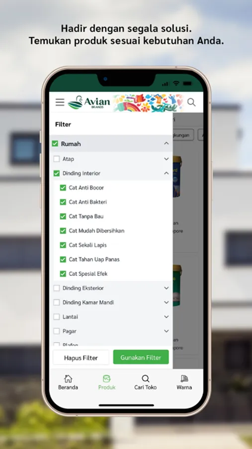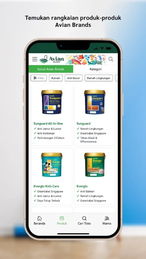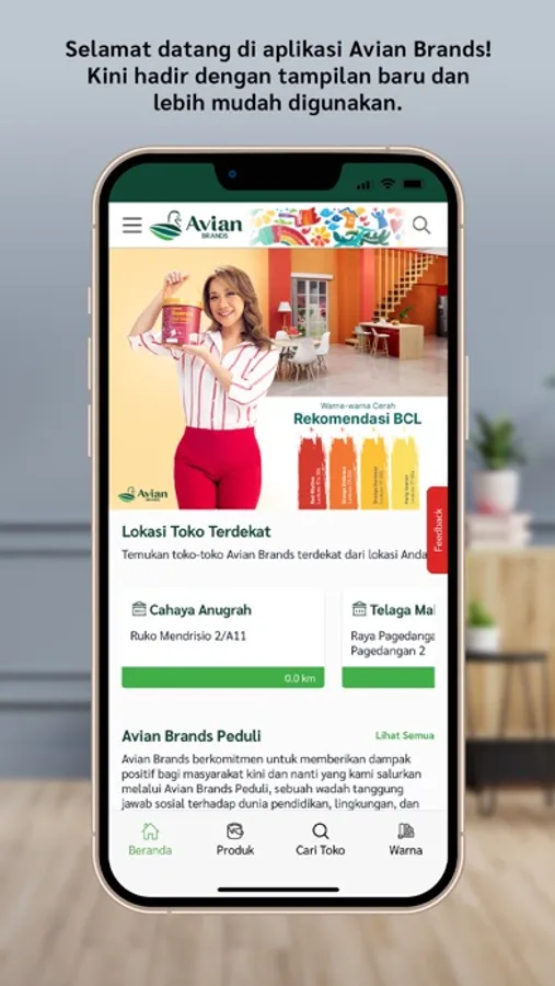 Avian Brands adalah produsen cat tanah air yang telah hadir untuk mewarnai Indonesia sejak 1978. Rangkaian produk cat terus kami hadirkan untuk memenuhi kebutuhan Anda dan tersedia di lebih dari 54.000 toko yang tersebar di seluruh Indonesia.
