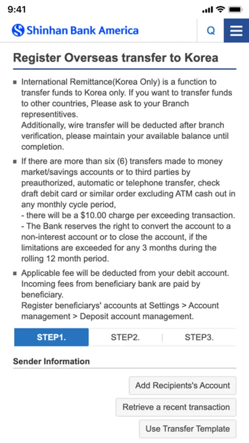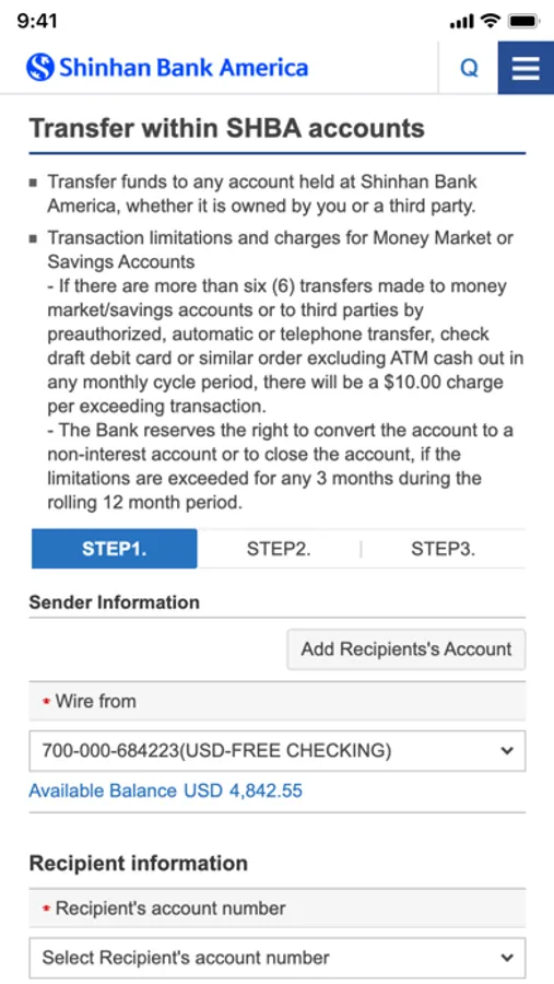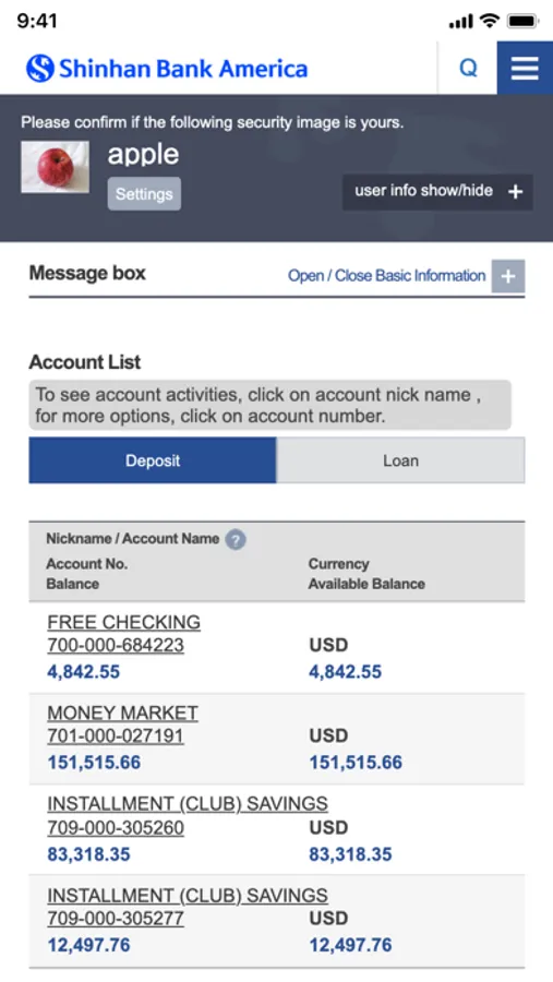 In order to use this app, you must enroll in our Internet Banking Service using your computer first. Once enrolled, you will be able to view your deposit or loan account balances and transactions histories, or transfer funds between your accounts held at Shinhan Bank America.
