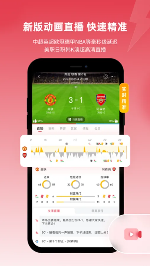 【动画直播】准确即时还原赛场战况的动画直播、快速精准的战报集锦,会在比分改写后及时告诉你所钟爱球队和关注比赛的比分,让你不错过每一场精彩比赛