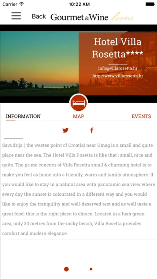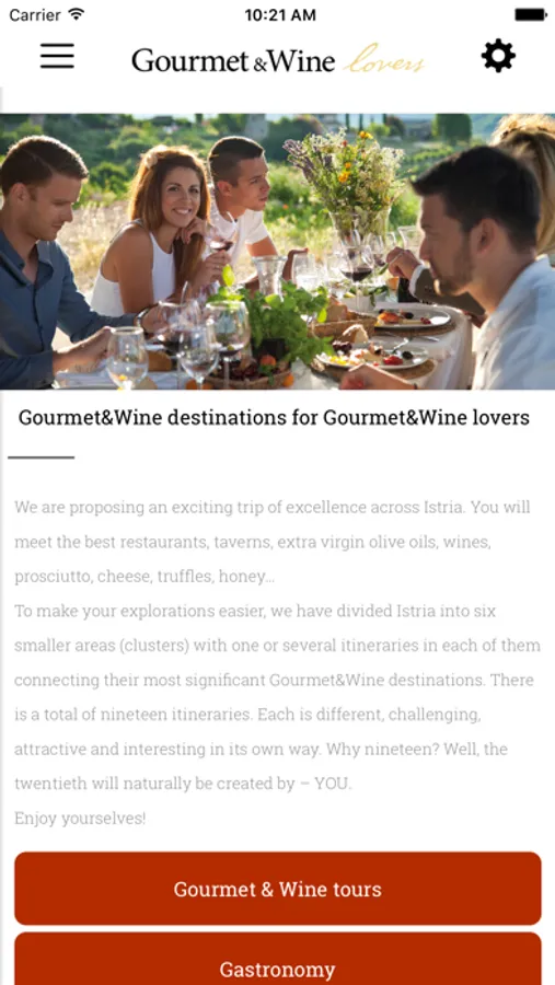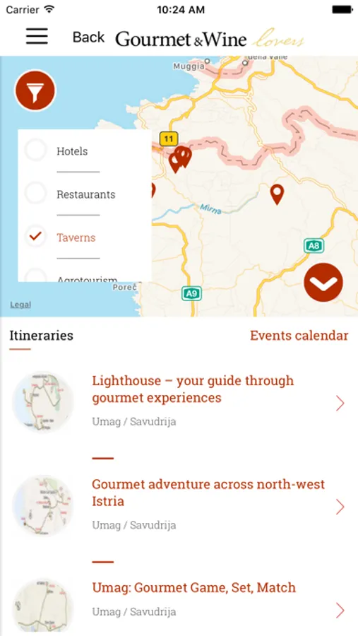 The Gourmet & Wine Lovers application introduces the Istrian gourmet offer to its users in a simple way. It is intended for all enogastronomic fans: journalists, opinion makers, enogastronomic experts, future guests. The application will be used as a platform for introducing attractive content including best restaurants and taverns in the region, superb wine and olive oil producers, olive tree growers and wine bars, truffle hunters, cheese as well as prosciutto and honey producers, best regional hotels and other interesting events. As we have divided Istria in six smaller areas (clusters), one or several itineraries have been developed for each cluster connecting its most important Gourmet & Wine venues. Paths have been named depending on the microarea and its gourmet specificity such as the Itinerary of the Novigrad Oyster or Four Soils for Four Experiences, the Momjan Musketeers' Muscat, Veli Jože and Teran, Rovinj Blue, Divine Tastes of South Istria and alike. The purpose behind the idea was to develop a tool for promoting Istria and its microdestinations. It will be used as a tool for developing special interest packages (TO, agencies) to be used as a finished product. It will also be interesting for restaurants as it includes a separate chapter on wine lists i.e. wines produced by wine producers included in the application. Thus, a certain wine, a wine producer or a wine cellar will be more easily presented to a guest visiting a hospitality establishment. The same applies to olive oils, including not only an olive oil producer profile but also a separate paragraph containing a detailed 'identity card' of olive oil presented in the world extra virgin olive oil guide Flos Olei. It is interesting to mention that the application offers a direct link to the Istria Tourist Board web site for automatic access to the gastronomic events calendar which will facilitate users ability to be informed on daily regional and gourmet events at any time.
