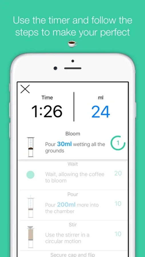 A timer to help you brew a great cup of filter coffee. Simply choose your preferred method, number of cups desired and follow the brew guide and timer.