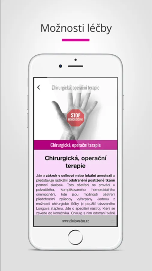 Mobilní aplikace Hemoroidy je určena pro pacienty s hemoroidálním onemocněním, které podle odhadů vyskytuje až u 40 % obyvatelstva. Aplikace přináší komplexní přehled důležitých informací o příčinách, symptomech a možnostech efektivní léčby tohoto častého onemocnění konečníku.