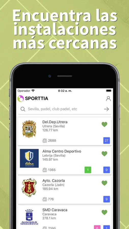 Sporttia está presente en más de 80 municipios de toda España. Tan solo tienes que activar tu localización y aparecerán los centros deportivos más cercanos a ti además de las actividades, eventos y partidos que se organicen en estos centros.