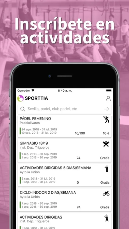 Con Sporttia puedes conocer todos los eventos y actividades que organizan nuestros centros asociados además de poder inscribirte a ti o a otras personas y, por supuesto, poder pagar estas inscripciones.
