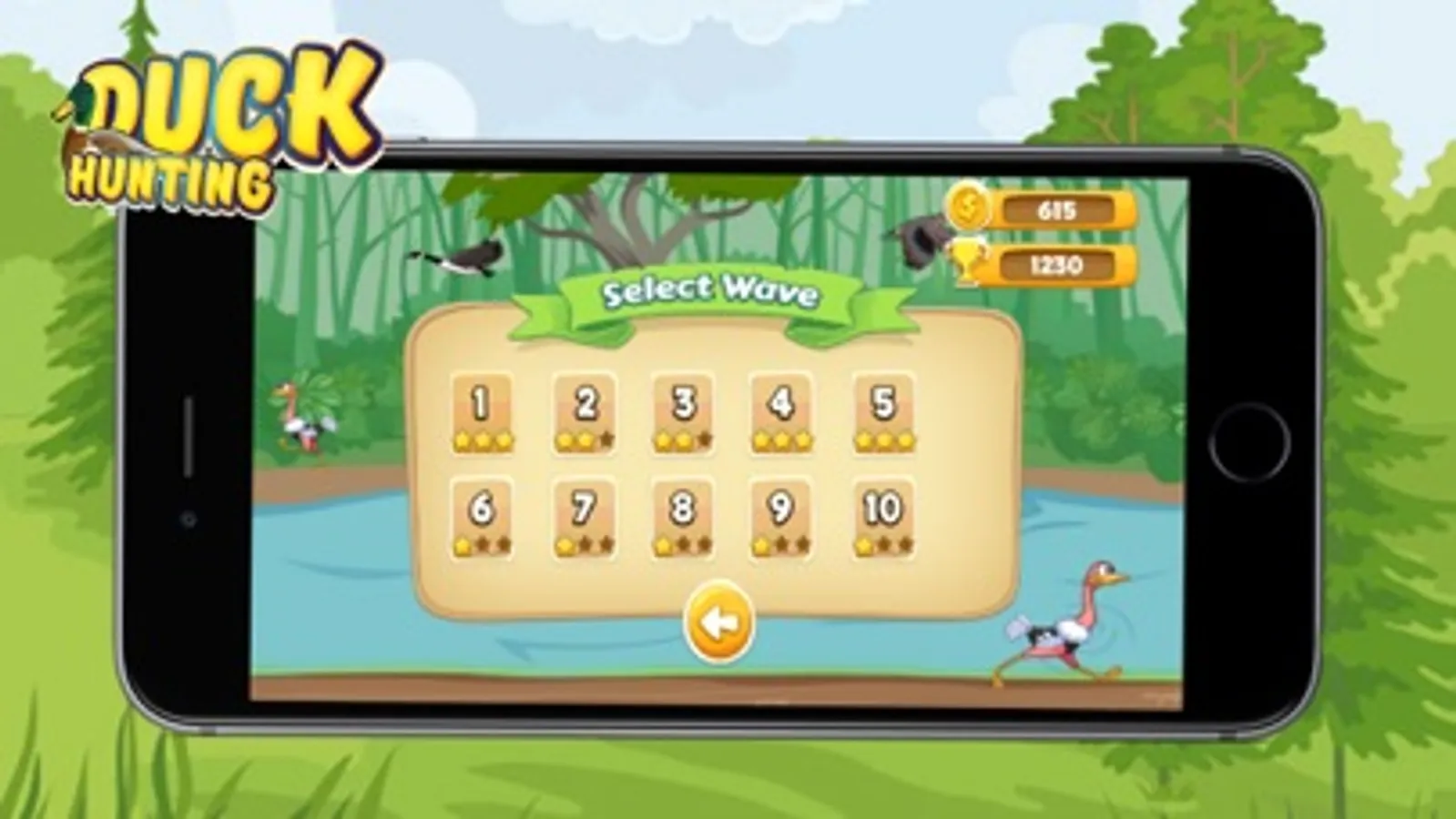 2D Duck Hunting Game contains multiple waves for users to play. Each wave has a limited time to hunt certain amount of ducks. By hunting down the ducks in less time is rewarded by 3 stars. Hunt down all the ducks using your hunting skills in the minimum time to earn 3 stars in each wave. Hunting down the other birds will cause the ultimate failure of the level.