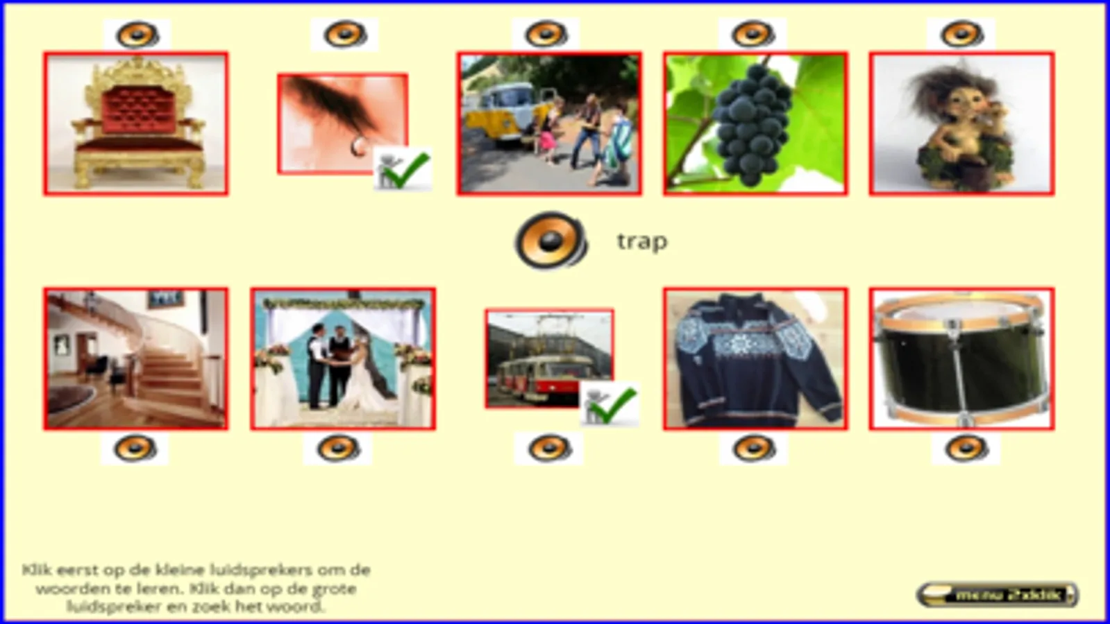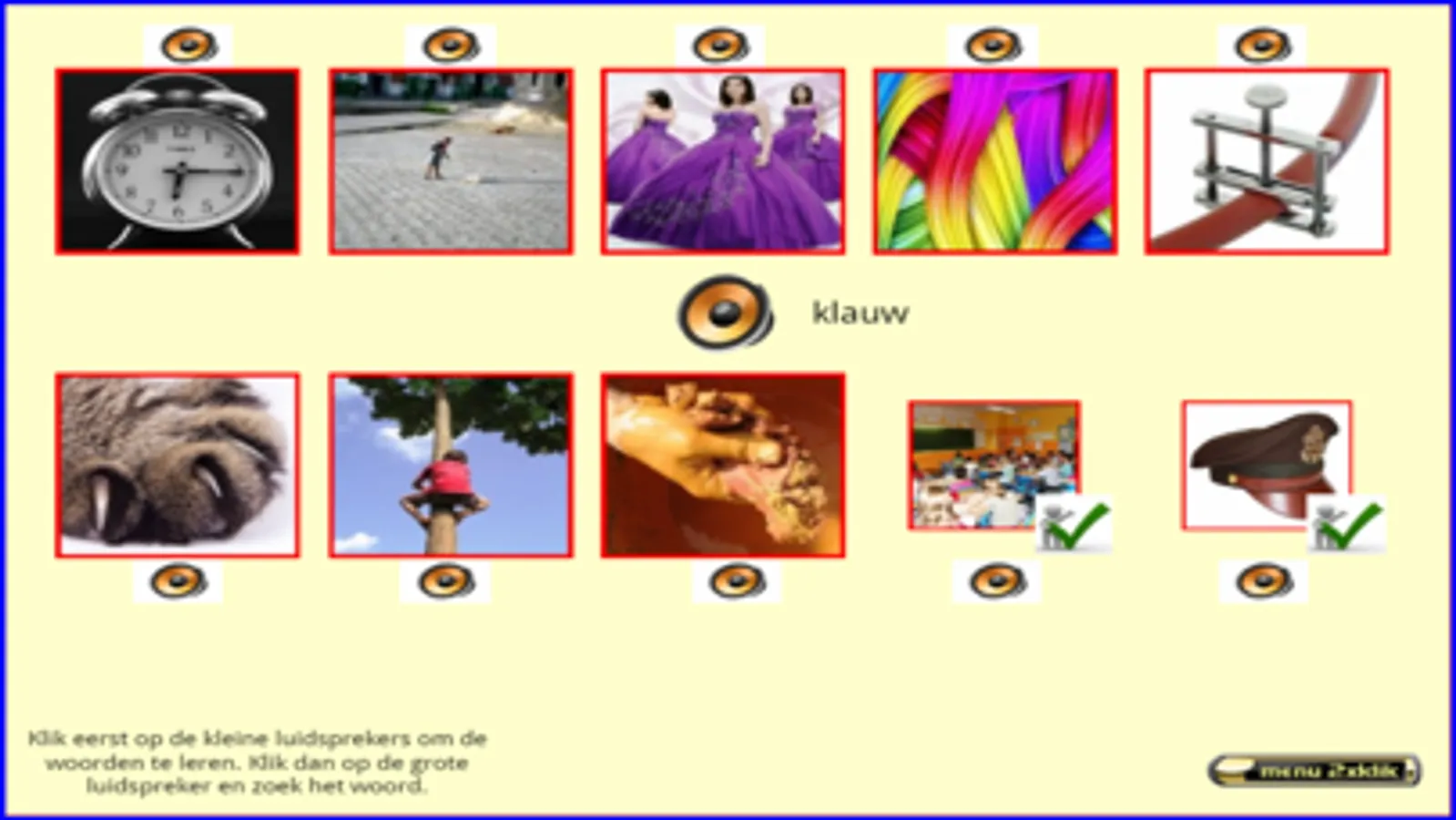 Deze taaloefening ‘auditieve synthese’ bevat 10 reeksen met elk 10 mmkm-woorden (100 woorden). Kies eerst uw reeks. Klik op de luidspreker (1 of meerdere keren). Het te zoeken woord wordt fonetisch uitgesproken met afzonderlijke letters. Probeer het te zoeken woord luidop uit te spreken en klik op de bijpassende prent. Bij een fout hoor je een foutmelding. Bij een correct antwoord hoor je het woord. Doe zo de 10 woorden. Op het einde zie je uw resultaat (%). Je komt na 5 sec automatisch terug op de beginpagina.