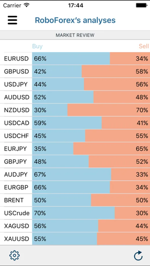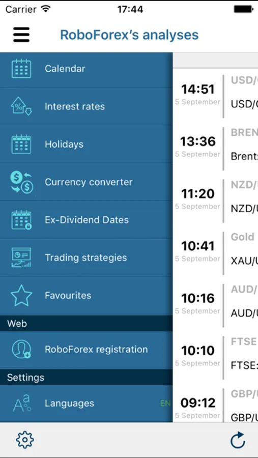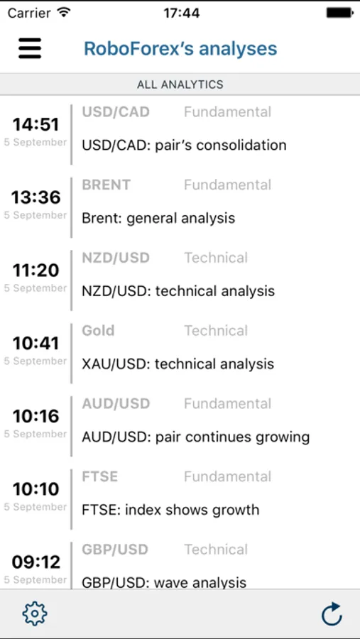 Mobile center of analytics from RoboForex is a portable version of the analytics service available to all clients of the Company. The mobile application provides you with access to all popular types of analytical reviews and the information on currency markets, along with main trading instruments and signals. All these features are available in your mobile device absolutely for free.