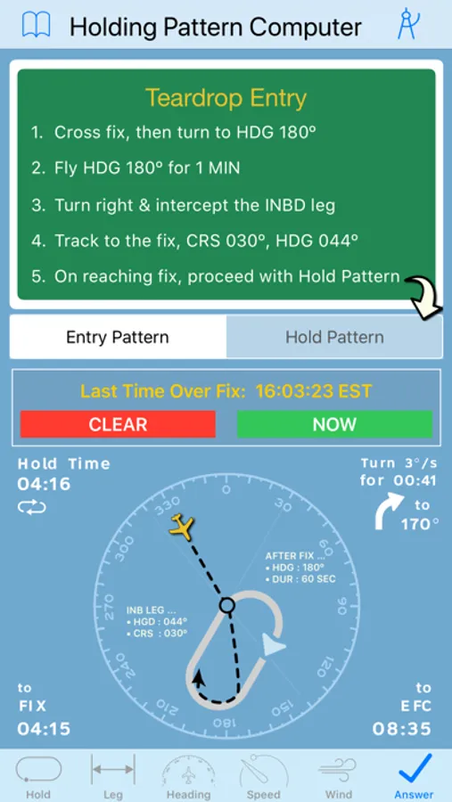 Whereas other holding pattern devices suggest an appropriate entry procedure such as direct, parallel, or teardrop, this Holding Pattern Computer takes it a step further. It provides turn-by-turn directions, including how long to fly a heading before initiating a turn- not only standard rate turns with bank limitations (30° manual flying and 25° with a Flight Director) but arbitrary turn rates too!