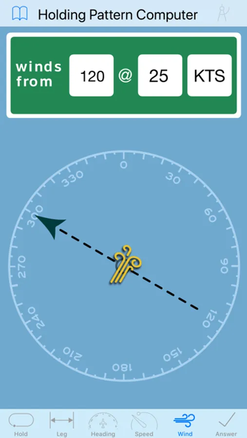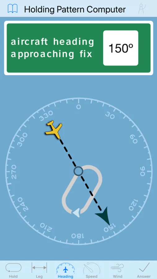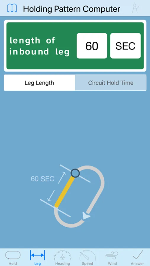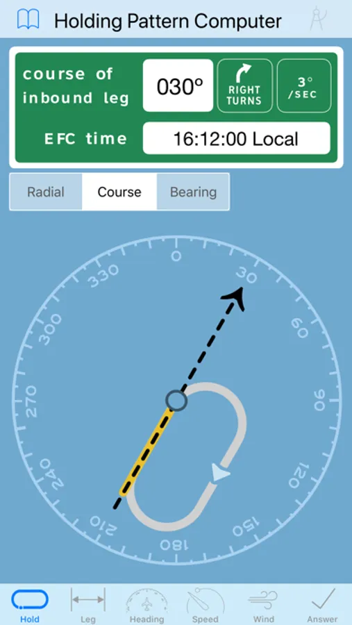 This app's primary goal is to provide the specific headings and timings needed to fly a holding pattern whereby the Pilot will roll out precisely onto the inbound leg exactly 1-minute, or other user-defined time or length, from the fix.