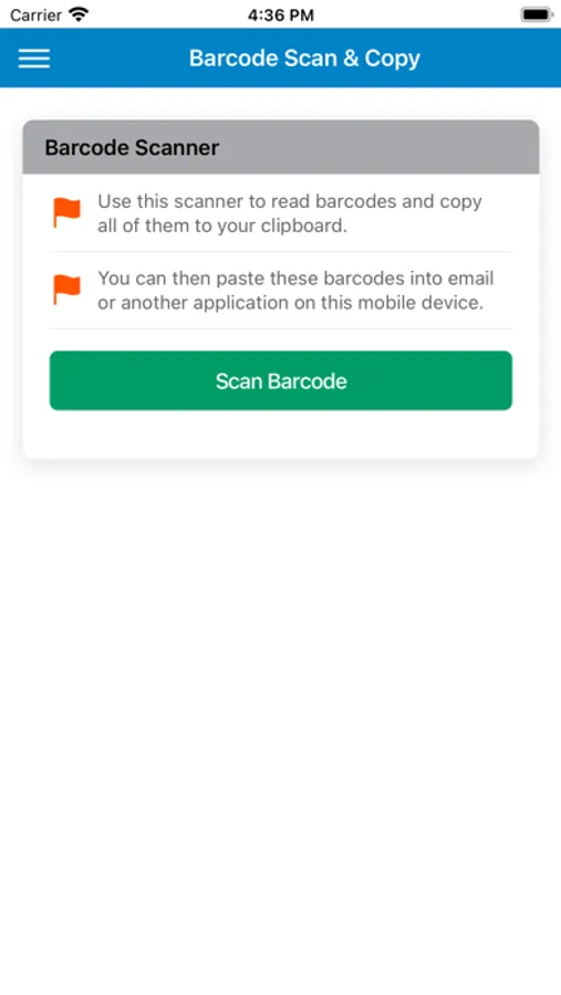 For "non-authenticated" users, the app provides the functionality to scan one or more barcodes and copy them to an email or another application on the mobile device. The following barcode types are currently supported: