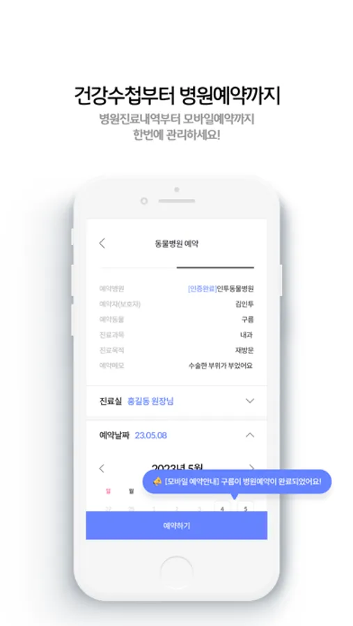 - 동물병원 전자차트 연동으로 반려동물의 내원/백신내역/복약/방문예정일까지 확인할 수 있습니다.