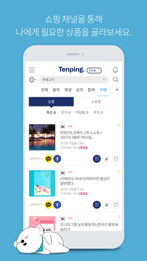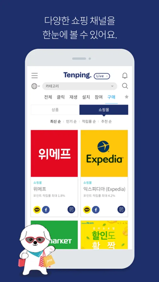 텐핑은 유익한 쇼핑 정보를 한눈에 볼 수 있게 도와주는 서비스입니다. 33만여 명(2018년 6월 기준)의 사용자가 사용하는 텐핑은 실시간 소셜 쇼핑으로 다양한 상품의 정보를 지속적으로 업데이트 합니다.