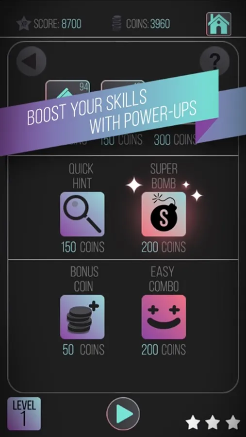 • UNIQUE POWER UPS. Use coins you get to get boosts and power ups to beach each level.