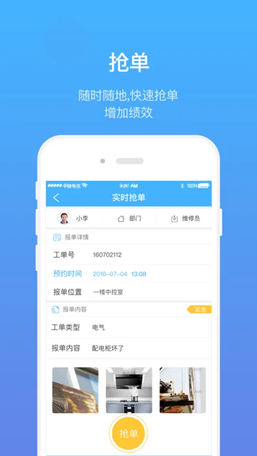 报修模块 : 可以实现报、修两端直通,员工一键抢工单挣绩效,时时掌控进度随时抓取数据,大大缩短了沟通时间,提高了故障响应速度,压缩了管理层级。