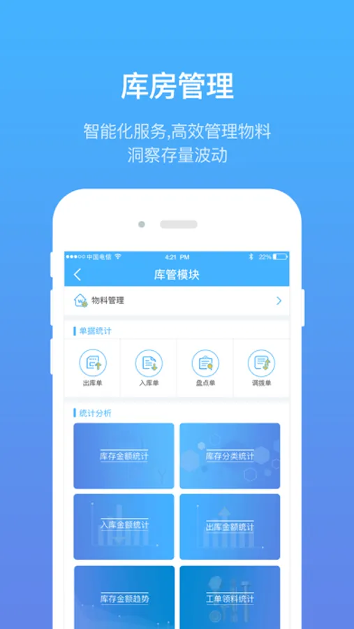 库管模块:打通维修、维保模块,配件使用实时跟踪,多库房分类别入库,便于记录和查询,提前设置备件量,库存不足实时预警。
