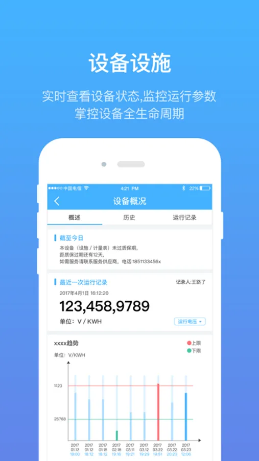 设备模块 : 实现云端设备台账,设备完好率实时呈现,运行参数无缝对接,实时掌控设备运行状态和全生命周期。