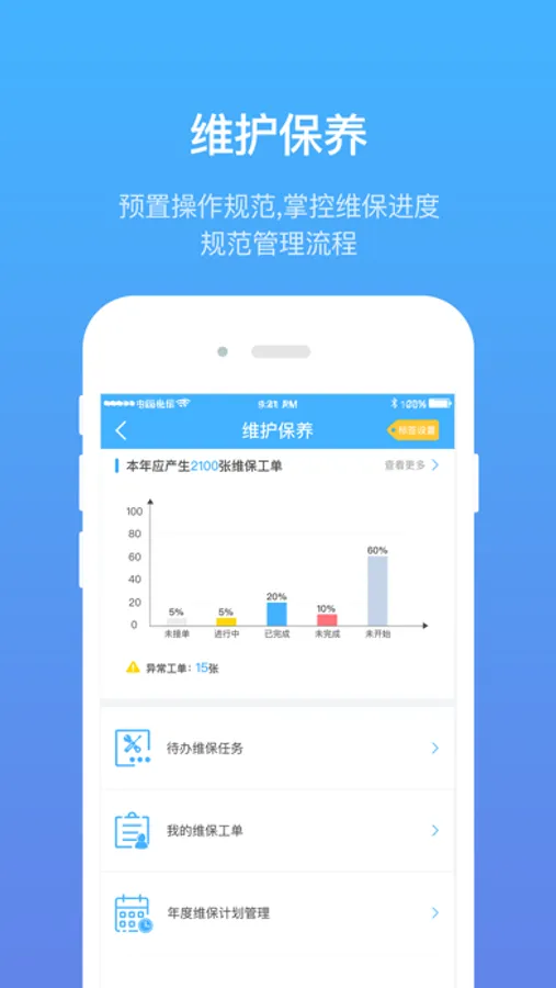 维保模块:提前预置维保作业和操作规范,NFC技术杜绝造假,全年计划随时调整,维保情况实时统计追踪,保障维保计划完整落实。