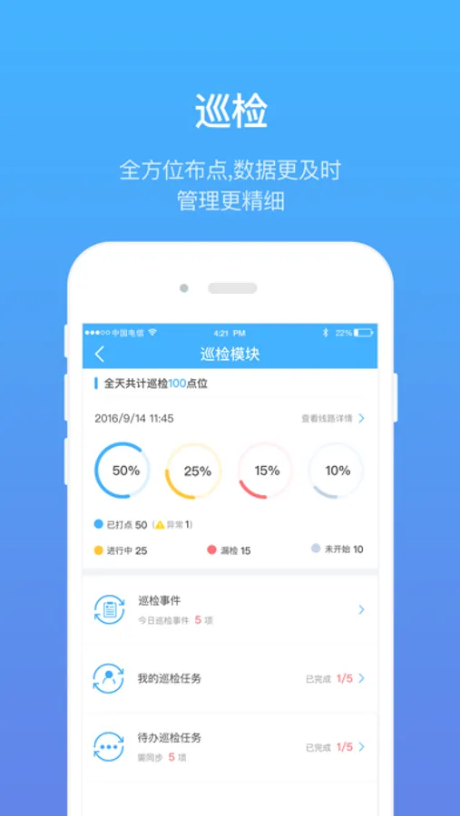巡检模块:单点支持多个工科,NFC打点防止人为造假,离线巡检无需担心网络状况,可支持预防性巡检,巡视问题随时呈现。