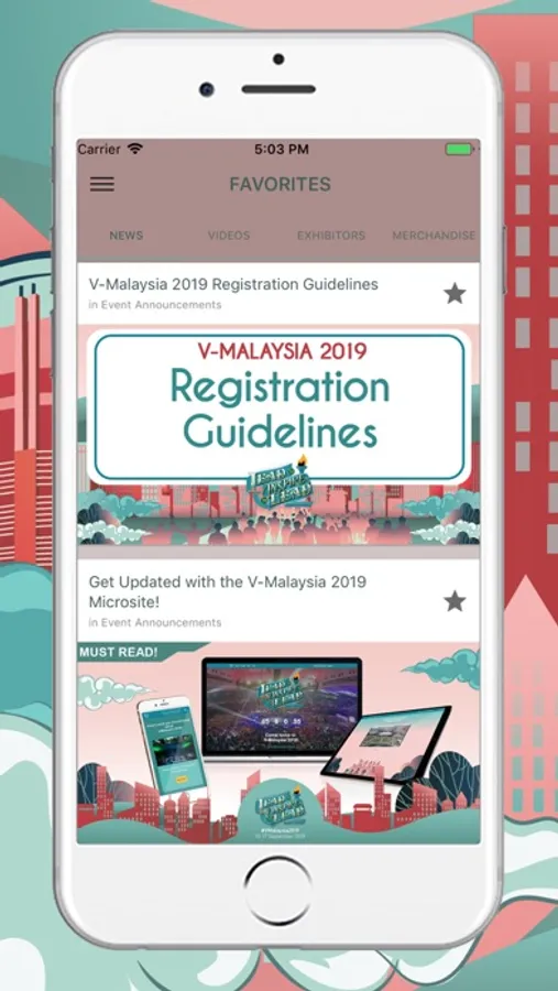 The V-Malaysia 2019 mobile app is made for all V-Malaysia 2019 participants, who are determined and inspired to lead. It is packed with comprehensive and dynamic features such as a crowd-sourced feed, exhibitors’ page, personalized page for all your saved favourites, notes, #VMalaysia2019-marked photo generator, exclusive merchandise dock, regular news and updates, and a special dock for all V-Malaysia 2019 videos! You can even select the language of your choice to use the app in English, Arabic, Bahasa-Indonesia, French, Russian, or Turkish!