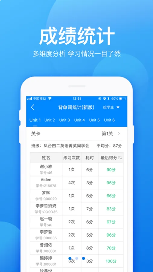 4、成绩统计:支持背单词、备考训练、绘本、口语等成绩统计。