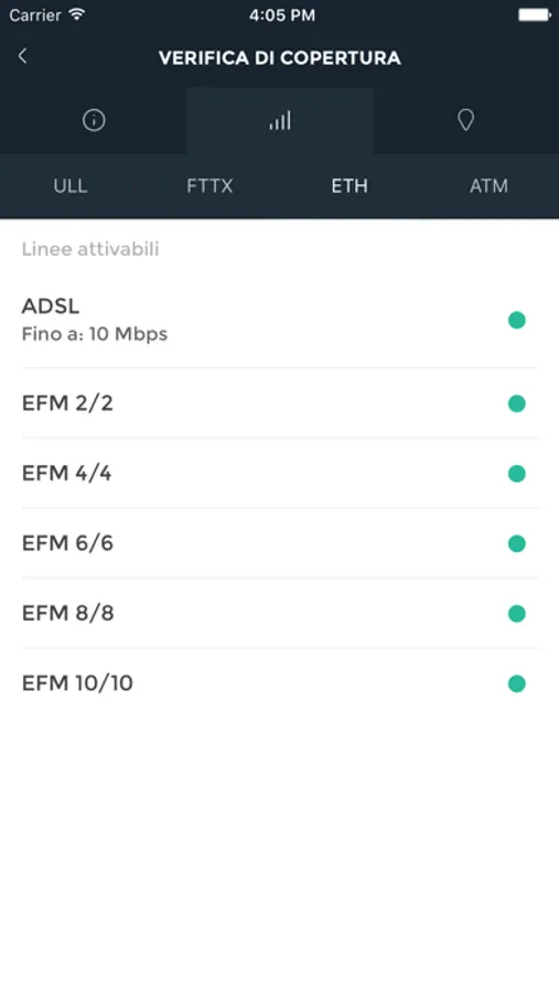 Questa App, dedicata ai nostri Rivenditori, consente di utilizzare parte degli strumenti presenti nell'Area Riservata, come ad esempio la verifica di copertura dei servizi Internet: ADSL, Fibra Ottica, ULL e Wireless.