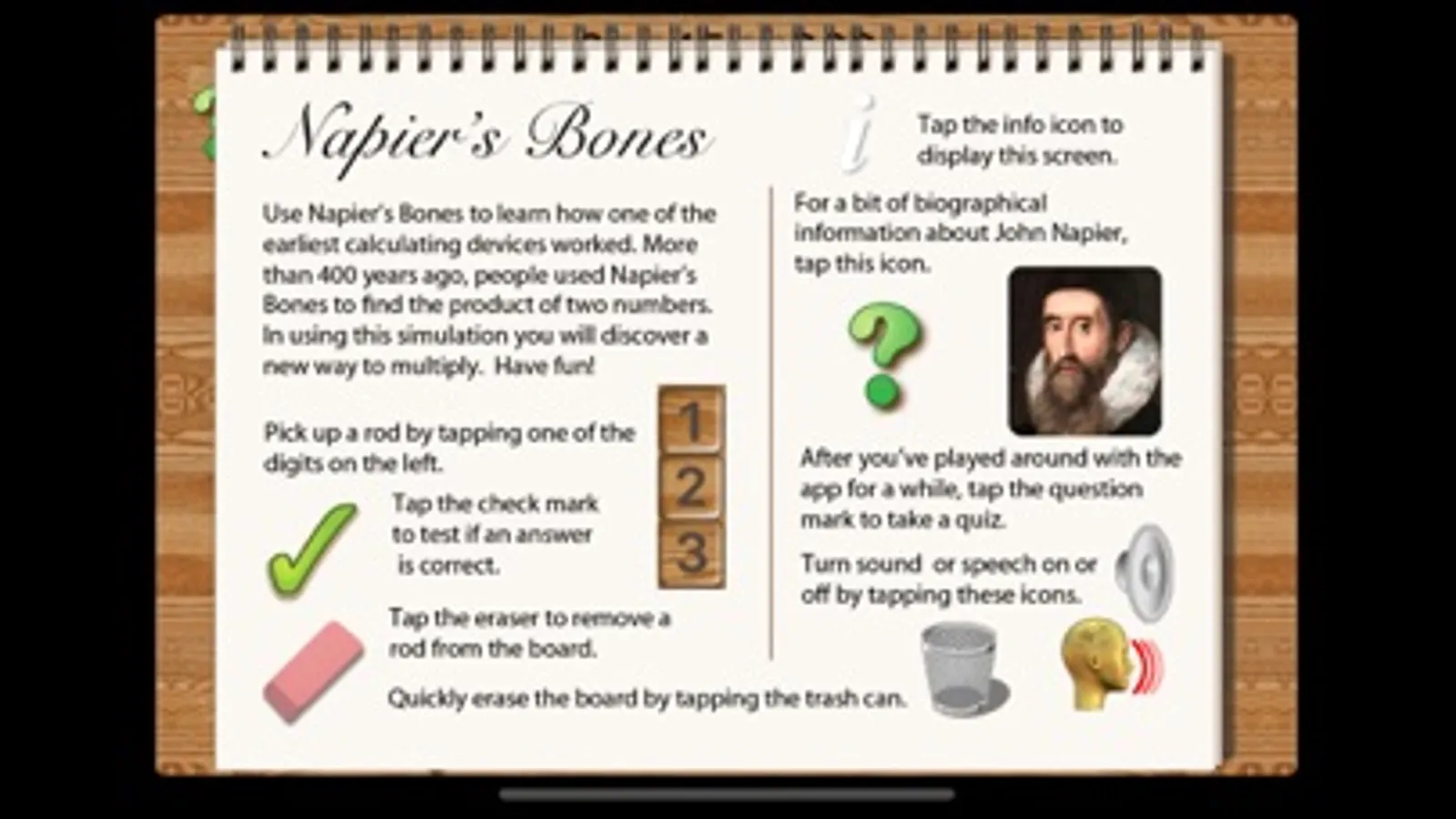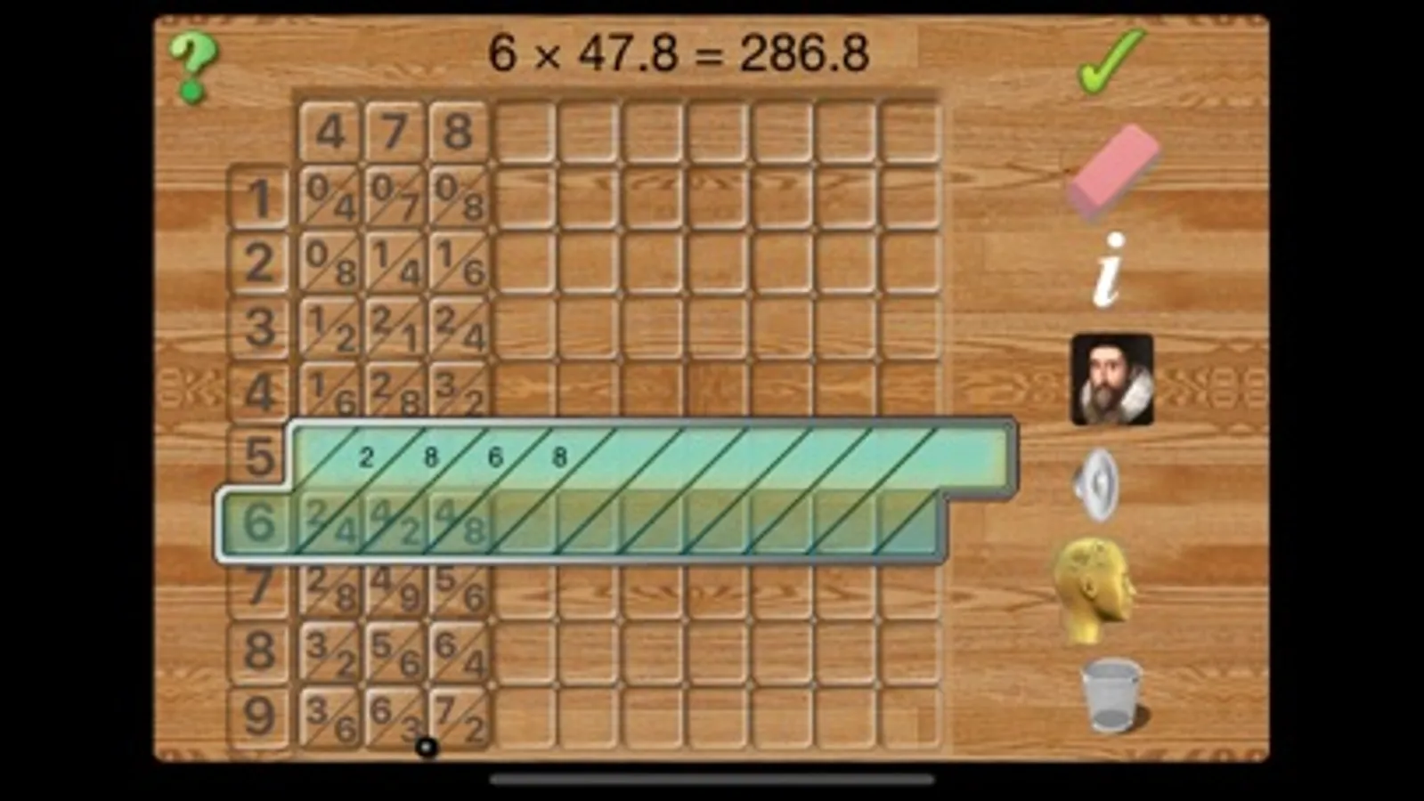 Use the Napier's Bones app to learn how one of the earliest calculating devices worked. More than 400 years ago, people used Napier's Bones to find the product of large numbers. In using this simulation you will discover a new way to multiply. Have fun!