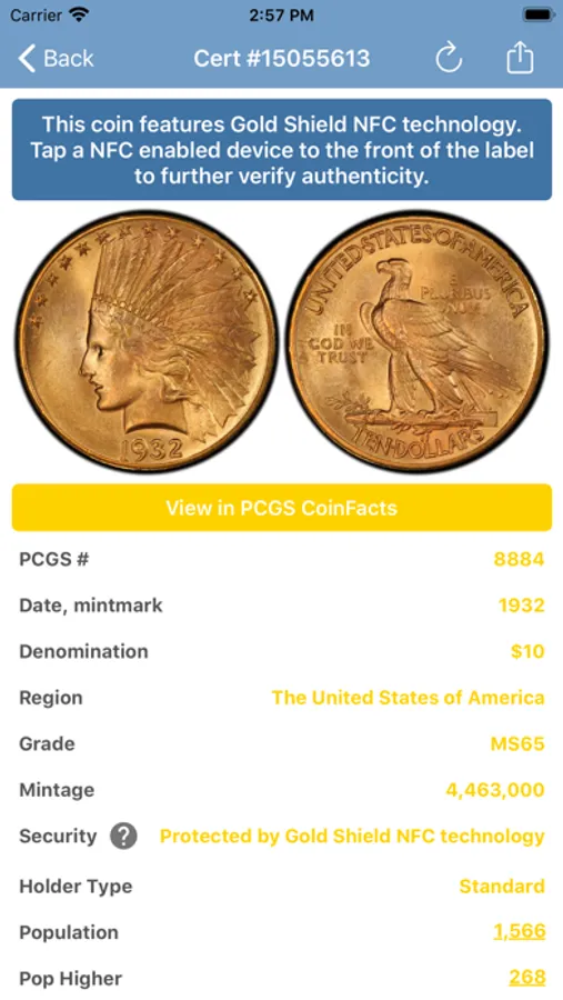 The Cert Verification App makes the confirmation process much easier and much faster. Rather than typing in the coin or banknote's certification number, simply scan the barcode (obverse) or QR code (reverse) found on the label or utilize our new Gold Shield NFC Technology to tap and scan a holder with additional security (if available).