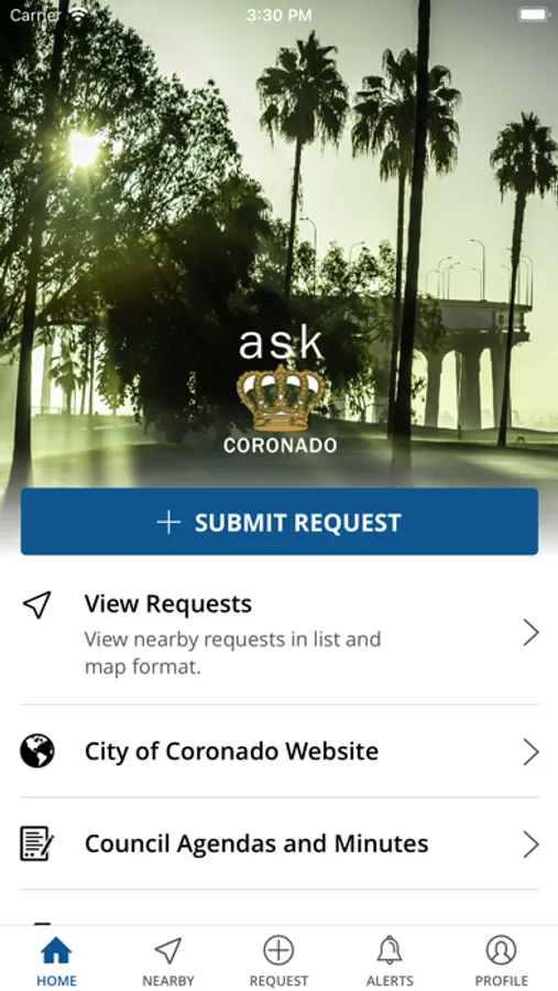 With Ask Coronado, residents, businesses and visitors now have enhanced customer access to a number of government-provided services 24-hours a day, 7 days a week. With this app, you can quickly and easily submit service requests, such as reporting a street light out, pothole or water conservation issue by completing a short description of the request. A photo may be included to provide additional details. Reporting parties will be notified as soon as their issues are resolved, and may monitor their requests. The City of Coronado looks forward to serving you.