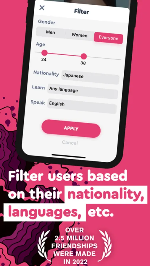 Learn new languages and discover new cultures directly with locals, while making international friends based on people’s language interests, hobbies, nationality, gender, age, and more!