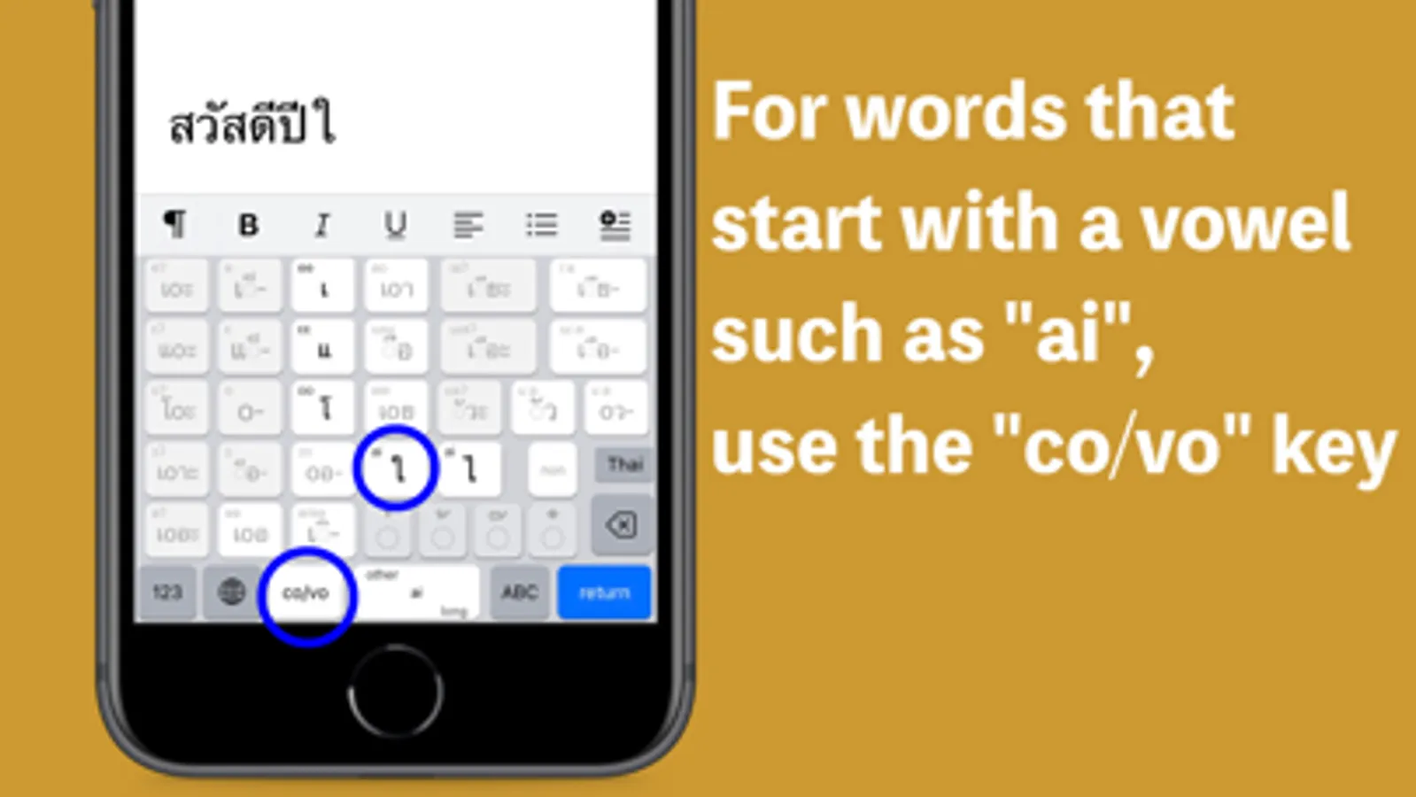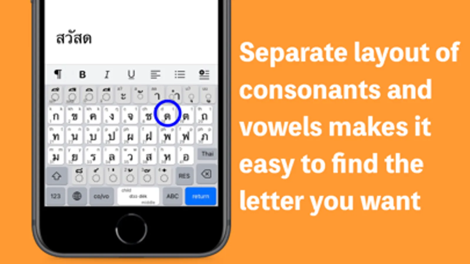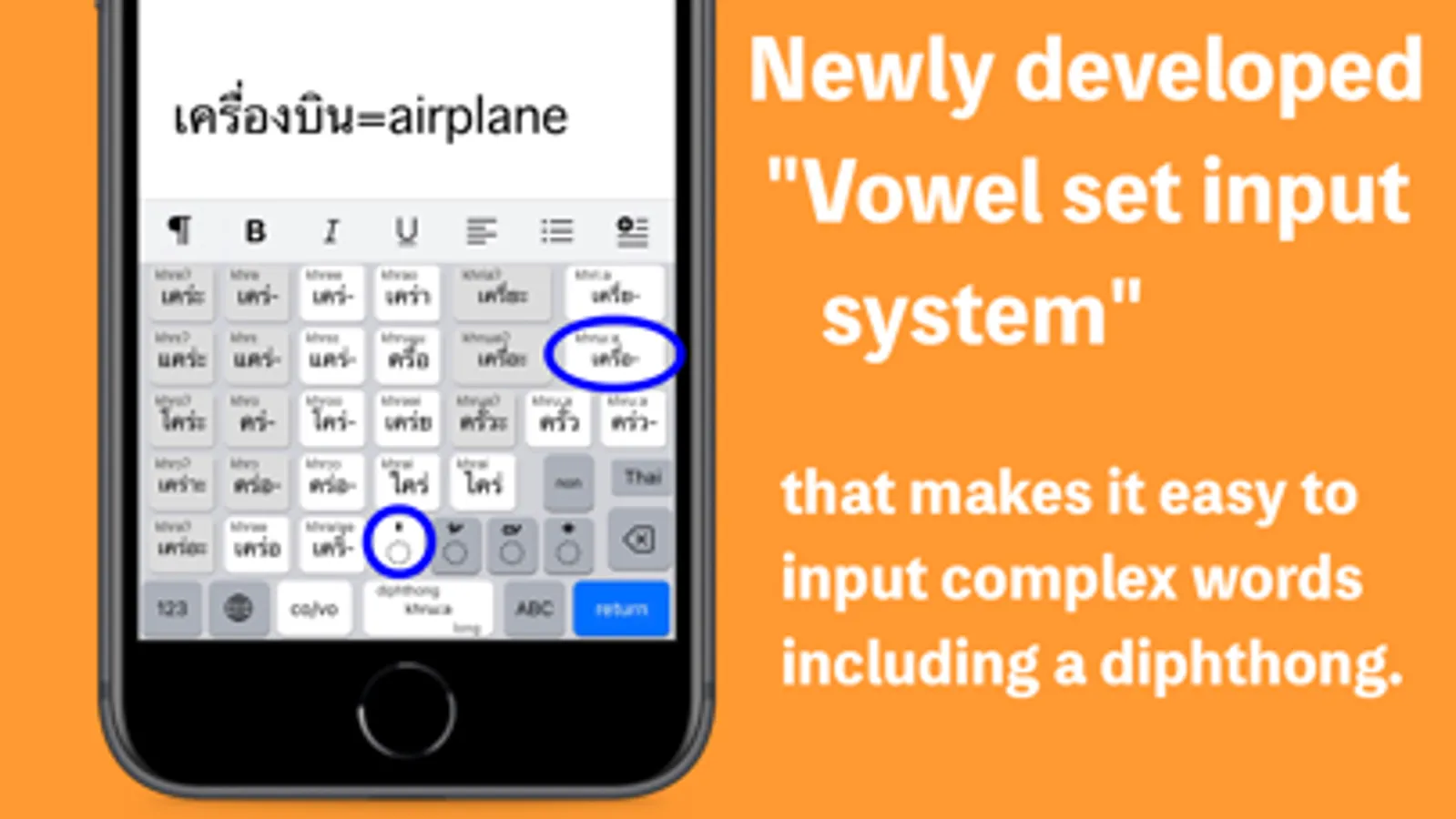 For example, when entering “เดี๋ยว: Immediately”, you can enter “เดี๋ย” with one tap, after you choose the initial consonant “ด” and the tone mark “+”.