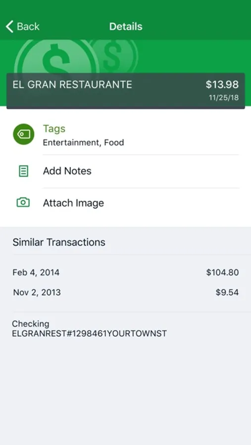 Add Tags, Notes, Images & Geo-Information: By enhancing transactions with custom tags, notes or photos of a receipt or check, you have the ability to stay organized and find exactly what you’re looking for when searching through your finances.