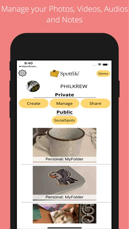 With Spotfile you can Create, Manage, and Share data files of photos, videos, audio and notes (called Spotfiles) privately and publicly.