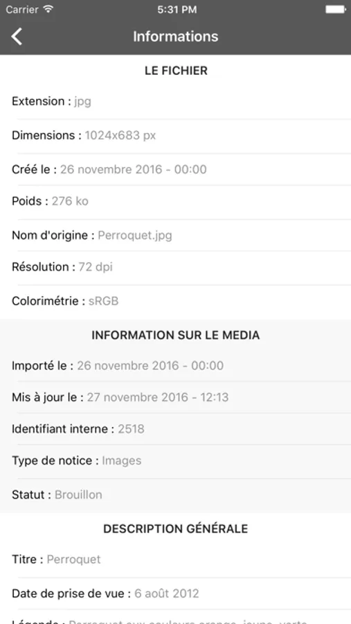 Grâce au mode détail, vous retrouvez toutes les informations concernant le média. Vous passez d'un contenu à l'autre par simple balayage des doigts sur l’aperçu.