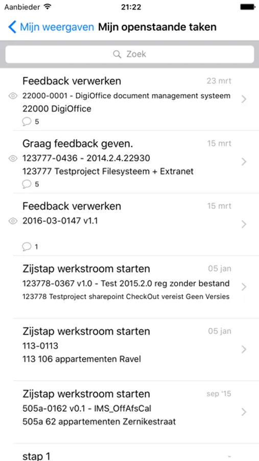 De DigiOffice DMS App heeft weergaven voor ‘alle’, ‘mijn’ en ‘favoriete’ documenten. Hiermee heeft u altijd en overal inzage in documenten die in DigiOffice DMS geregistreerd zijn. De taken- en documentenlijsten zijn bovendien geoptimaliseerd voor het gebruik van grote lijsten. Het zoeken wordt op de server uitgevoerd. Ook is infinite scrolling toegepast dat ervoor zorgt dat zoekresultaten automatisch bijgeladen worden op het moment dat het einde van de ingeladen lijst nadert.