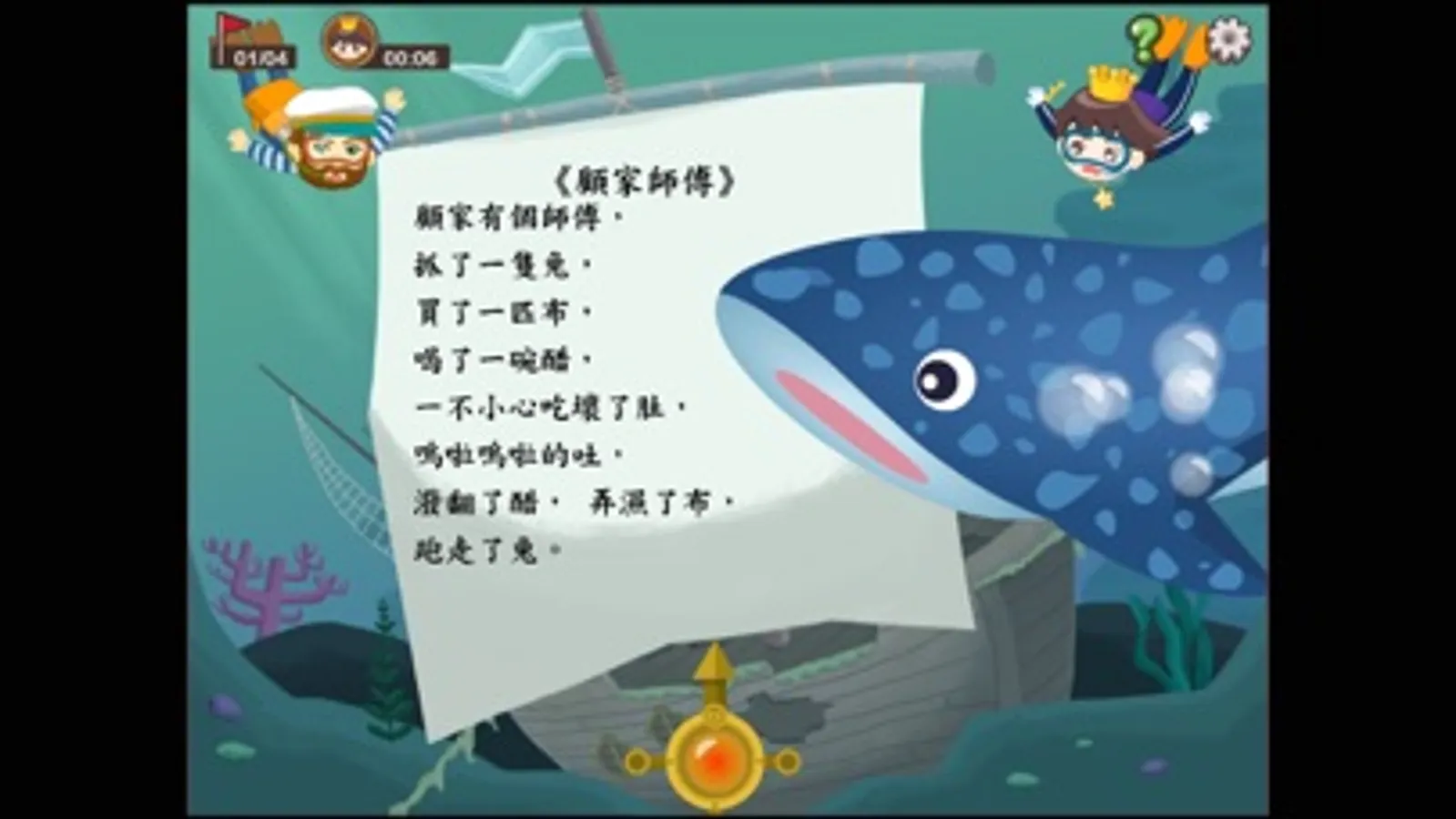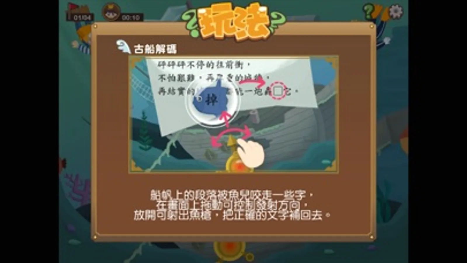船帆上的文章被魚兒咬走一些字,在畫面上拖動可控制發射方向,放開即射出魚槍,把正確的文字補回去