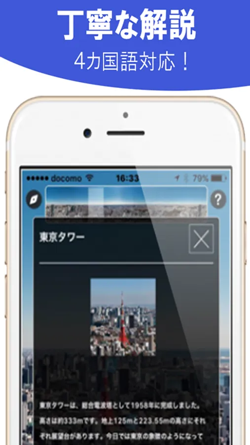 4.虫眼鏡ボタンでビルや施設などの解説を見ることができる