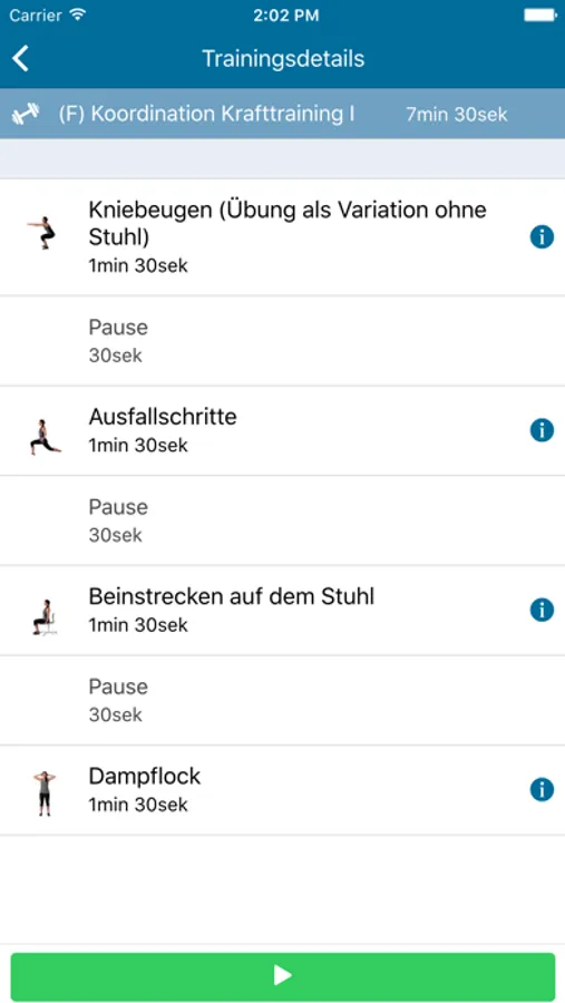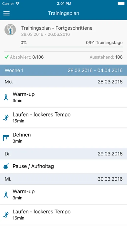 Fitnessprogramm geleitet.Die Trainingspläne jeweils für Einsteiger und fortgeschrittene bestehen aus Kardiotraining (Walken/Laufen), Kraft-, Warm-up- und Dehnübungen.