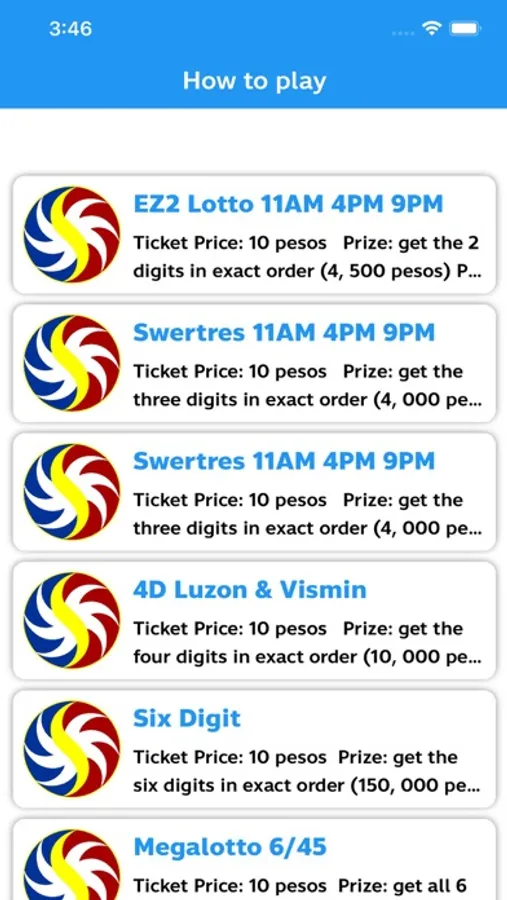 This application made to PCSO lotto results fan. It easy to use and fast PCSO lotto results. You will know all result (ex swertres result , ez2 result etc) with notification. The best (PCSO) Philippine lotto results today application with an alert at 11 AM, 4 PM, 9 PM for swertres result , ez2 and small town lotto. no need to go to outlet for check PCSO lotto results anymore or waiting to watch TV. Our application will be sent alert to you when result available. In addition, the app has a summary of winners and prizes every day at 9pm. Including an extra menu such as random numbers And the latest number statistics, last 30 days. Thank and enjoy it. We hope you find it easy to get PCSO results.