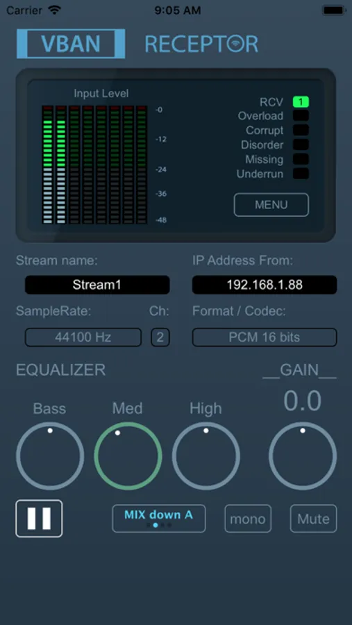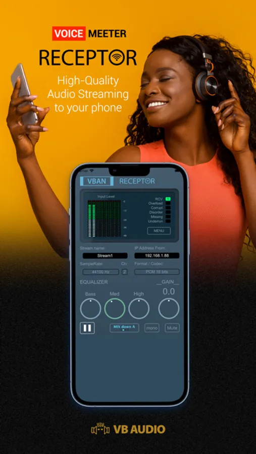 VB-AUDIO Software / VBAN-Receptor allows listening to any VBAN Streams in any audio formats (1 to 8 channels) and transform your mobile device in High Quality Wireless Headphone. The integrated 3 bands vintage EQ and Analog Gain Control will give you a unique audio experience.