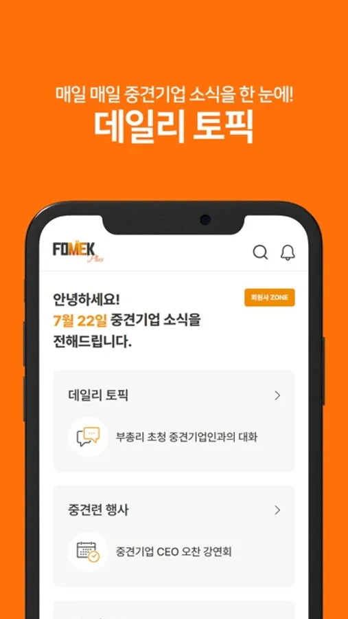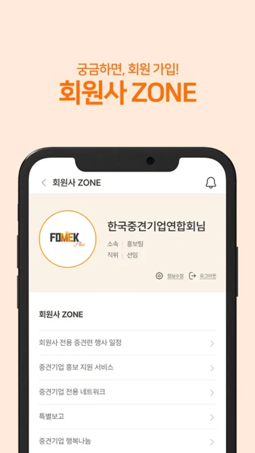 회원사 전용 행사 일정, 홍보 지원 서비스, 직급·직무별 중견기업 네트워크 등 회원사 전용 정보와 서비스를 확인·신청할 수 있습니다.