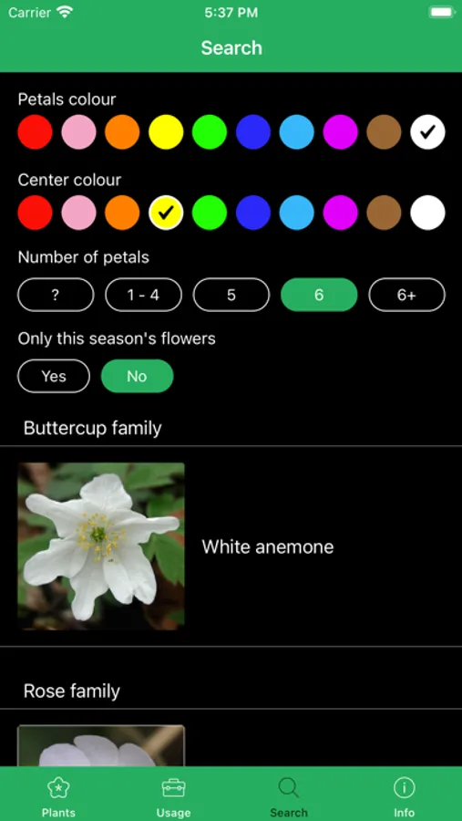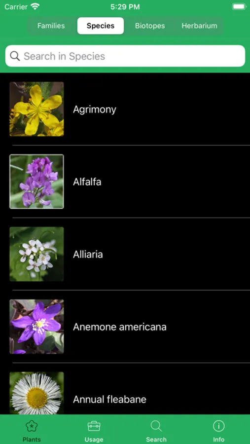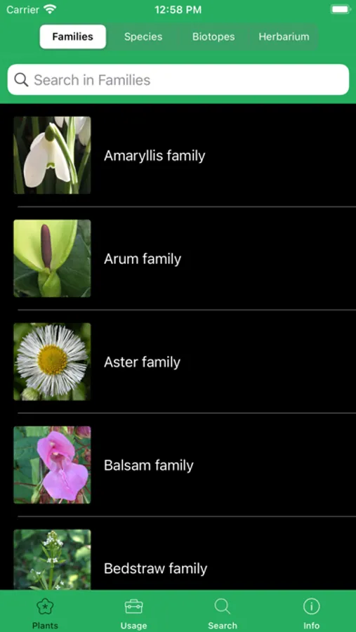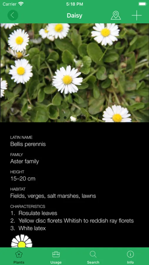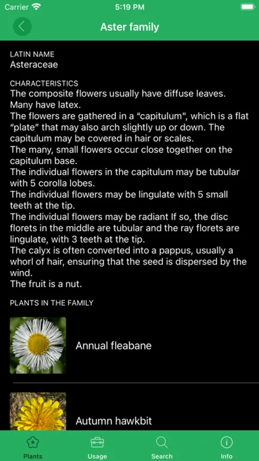 The app presents each plant with many details like Latin name, size, habitat, flowering period, and characteristics.