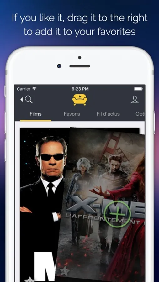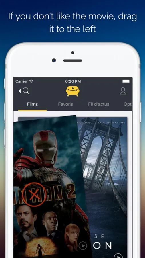 You don't like this movie ? Drag it to the left. You like this one ? Drag it to the right, it will be added to your favorites. Get all the information about the movie by dragging up, look at his trailer.